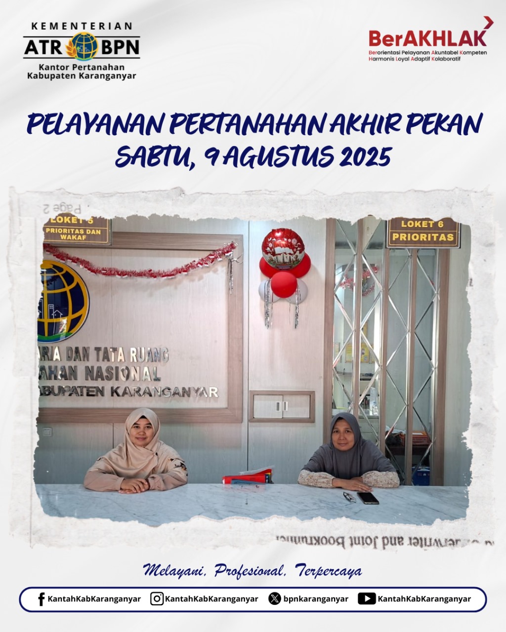 Yukk #sobATRBPN Karanganyar, ikuti dan pantau terus media sosial resmi Kantor Pertanahan Kabupaten Karanganyar untuk mengetahui update informasi seputar pertanahan!