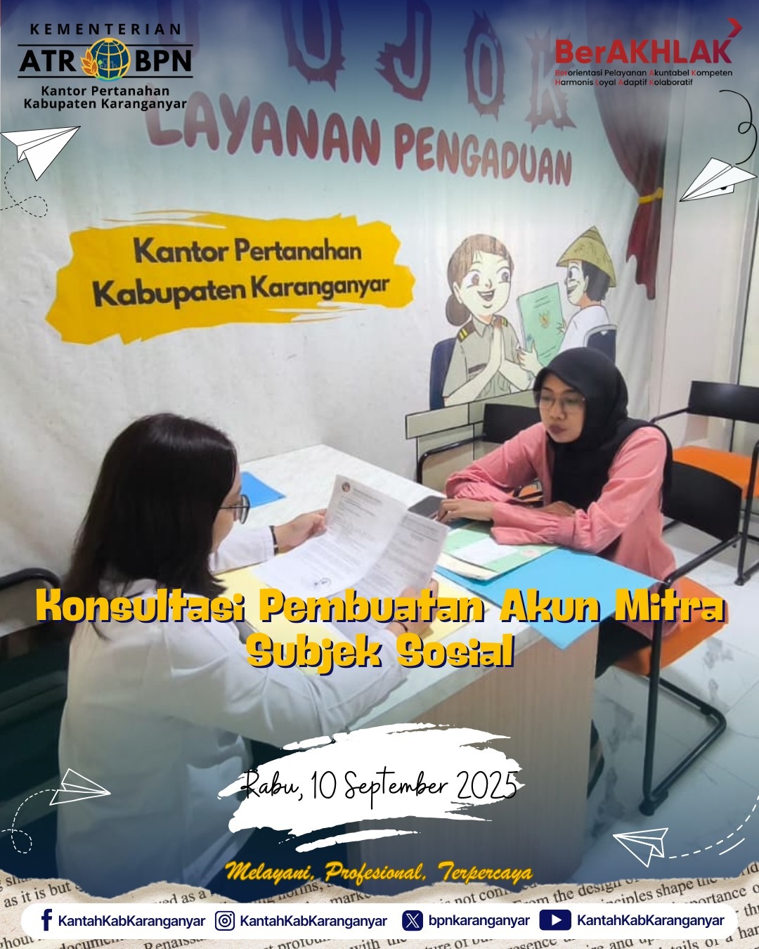 Yukk #sobATRBPN Karanganyar, ikuti dan pantau terus media sosial resmi Kantor Pertanahan Kabupaten Karanganyar untuk mengetahui update informasi seputar pertanahan!