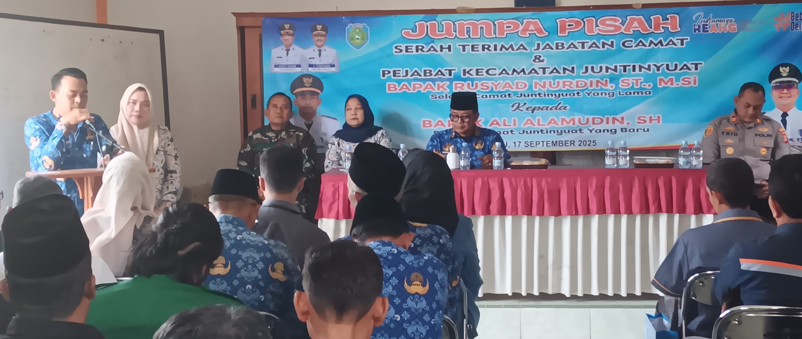 Indramayu,pikiranrakyatnusantara.com-Dalam rangka Jumpa Pisah dan serah terima Jabatan Camat,Pejabat Kecamatan Juntinyuat lama Rusyad Nurdin, ST., M.Si kepada Camat baru Ali Alamudin, SH. Kegiatan pisah sambut yang bertempat di Aula Kantor Kecamatan Juntinyuat Kabupaten Indramayu berlangsung khidmat pada Rabu 17/9/2025.
