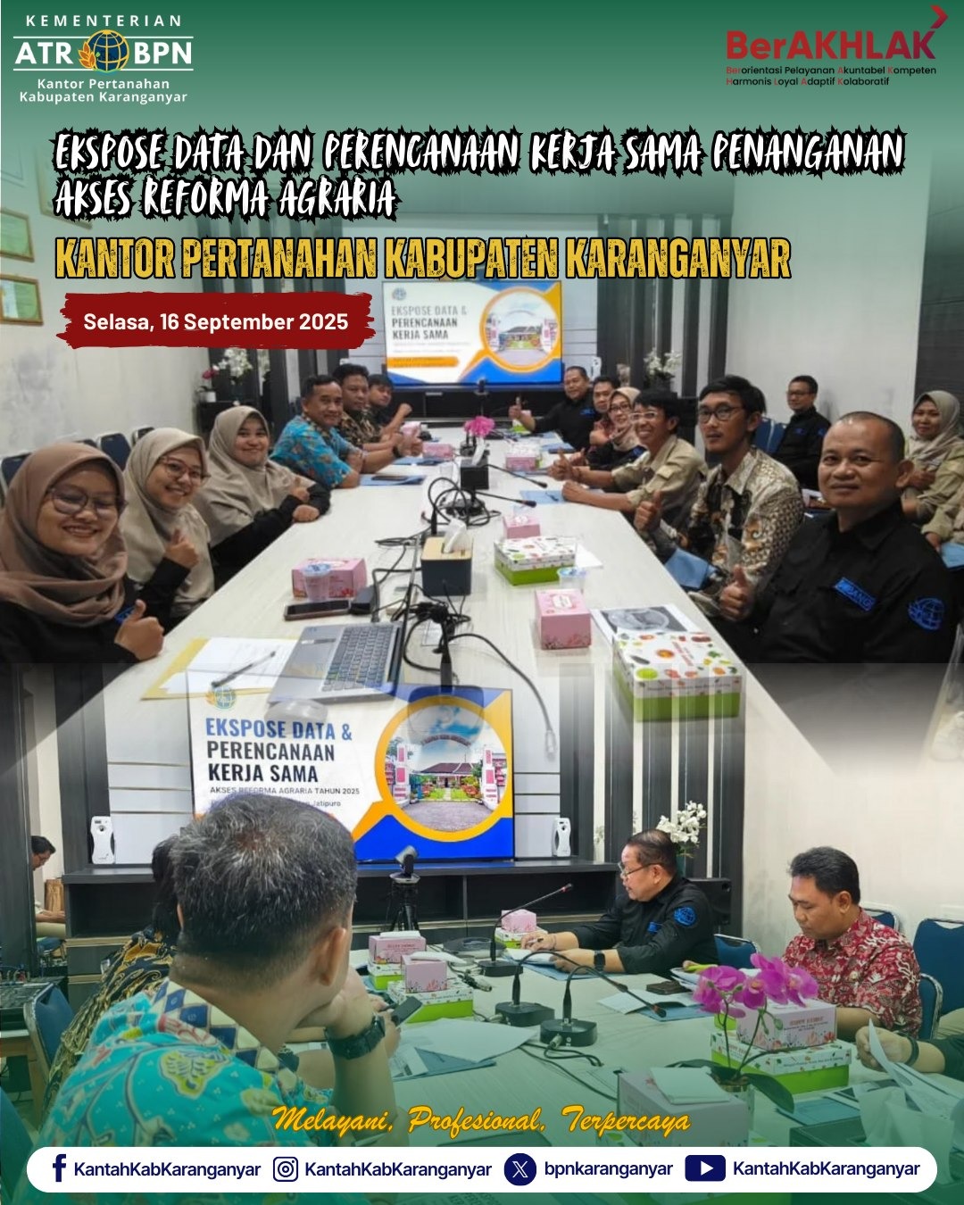 Selasa (16/9), Kantor Pertanahan Kab. Karanganyar menggelar kegiatan Ekspose Data & Perencanaan Kerja Sama Penanganan Akses Reforma Agraria yang dipimpin oleh Aris Sujarwadi, A.Ptnh., M.H.