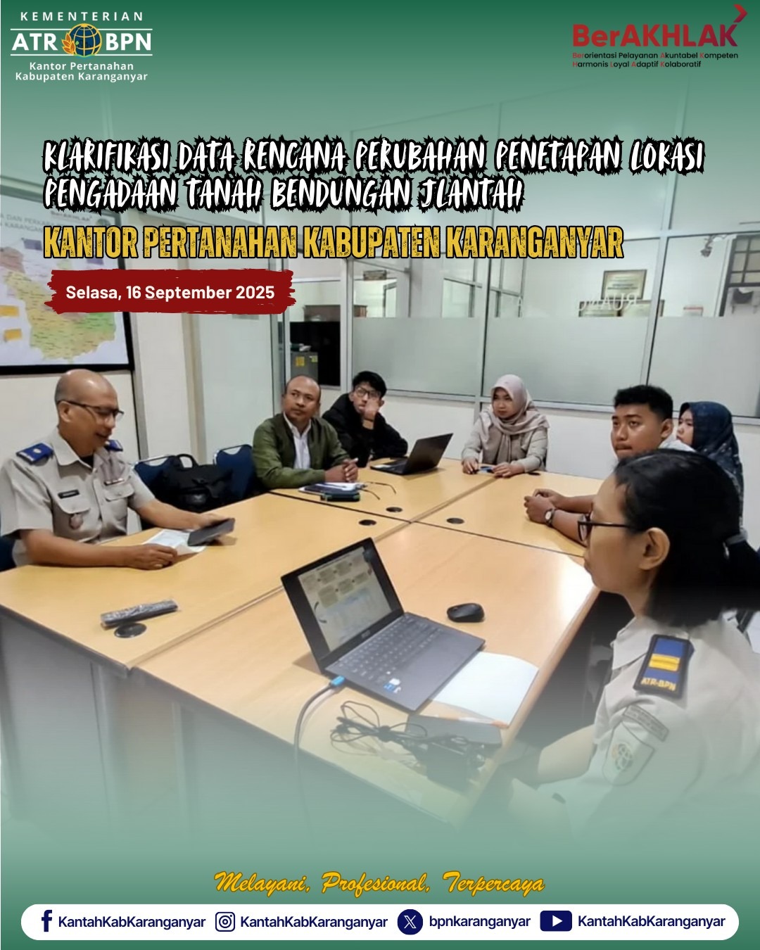 Selasa (16/9/2025), Kantor Pertanahan Kab. Karanganyar bersama PPK BBWS Bengawan Solo menggelar rapat koordinasi dan klarifikasi data membahas rencana perubahan Penetapan Lokasi pembangunan saluran irigasi DI Jlantah.