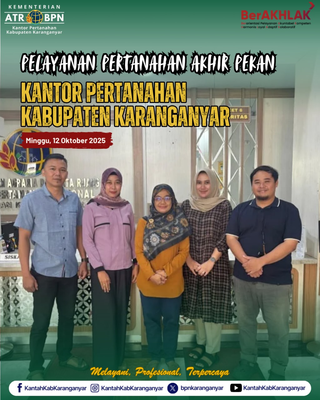 Yukk #sobATRBPN Karanganyar, ikuti dan pantau terus media sosial resmi Kantor Pertanahan Kabupaten Karanganyar untuk mengetahui update informasi seputar pertanahan!