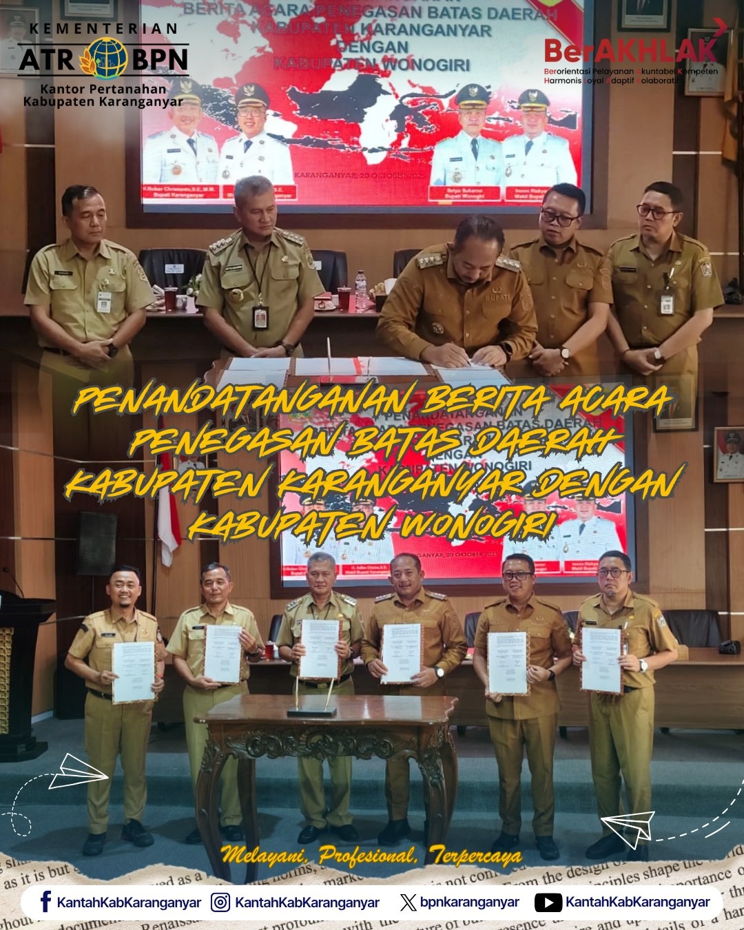 Senin, 20 Oktober 2025, telah dilaksanakan kegiatan Penandatanganan Berita Acara Penegasan Batas Daerah antara Kabupaten Karanganyar dan Kabupaten Wonogiri. Kegiatan ini berlangsung di Pendopo Rumah Dinas Bupati Karanganyar, Jl. Lawu No. 85, Cerbonan, Karanganyar, mulai pukul 09.00 WIB hingga selesai.