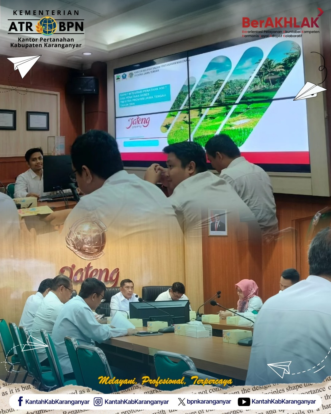 Dalam rangka mendukung pelaksanaan kegiatan Gugus Tugas Reforma Agraria (GTRA) Provinsi Jawa Tengah, Kantor Wilayah BPN Provinsi Jawa Tengah menyelenggarakan Rapat Integrasi Penataan Aset dan Penataan Akses Tahun 2025 yang dilaksanakan pada Rabu, 29 Oktober 2025 bertempat di Ruang Rapat Merapi, Kanwil BPN Provinsi Jawa Tengah – Semarang.