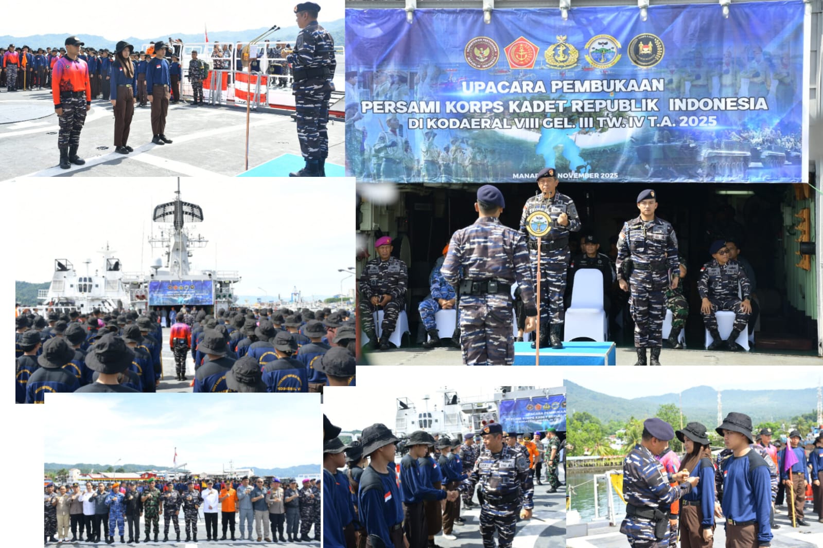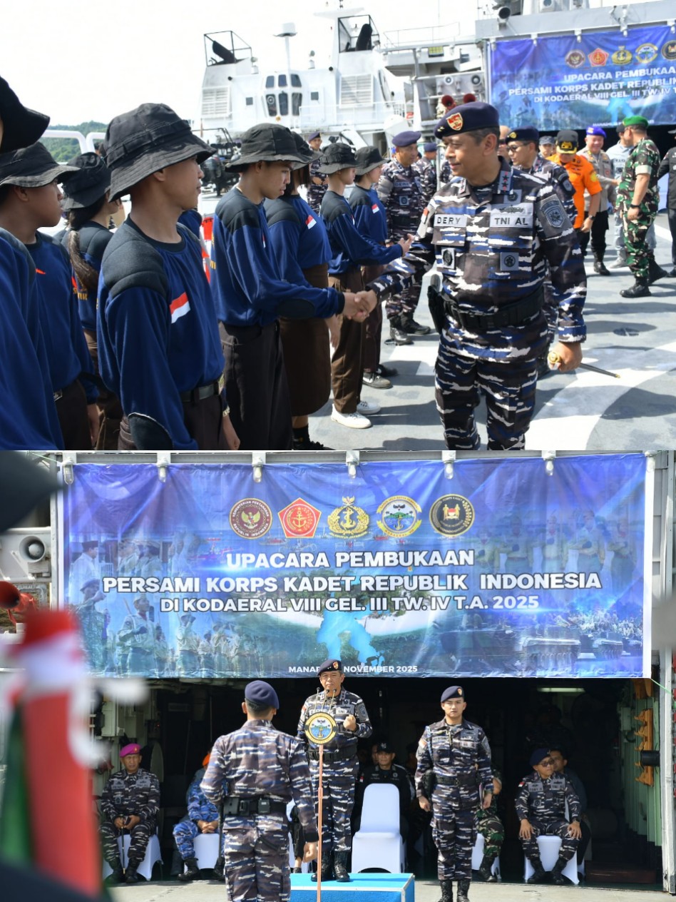 Dankodaeral VIII Laksda TNI Dery Triesananto Suhendi, S.E., M.Tr.Opsla. memimpin Upacara Pembukaan Perkemahan Sabtu Minggu (Persami) Korps Kadet Republik Indonesia (KKRI) Gelombang III Triwulan IV TA 2025. Upacara digelar di Geladak KRI Yos Sudarso–353 yang bersandar di Dermaga Samuel Languyu Satrol Kodaeral VIII Bitung, Sabtu (15/11/2025 )