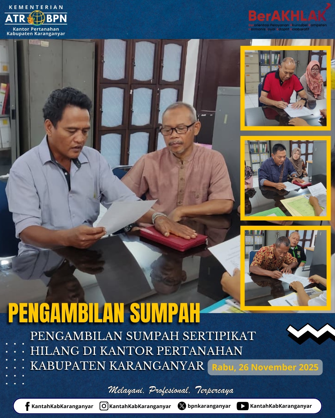 Rabu, 26 November 2025, Kantor Pertanahan Kabupaten Karanganyar melaksanakan kegiatan Pengambilan Sumpah Sertipikat bagi 7 (tujuh) pemohon sebagai salah satu syarat dalam proses penerbitan Sertipikat Pengganti karena Hilang.