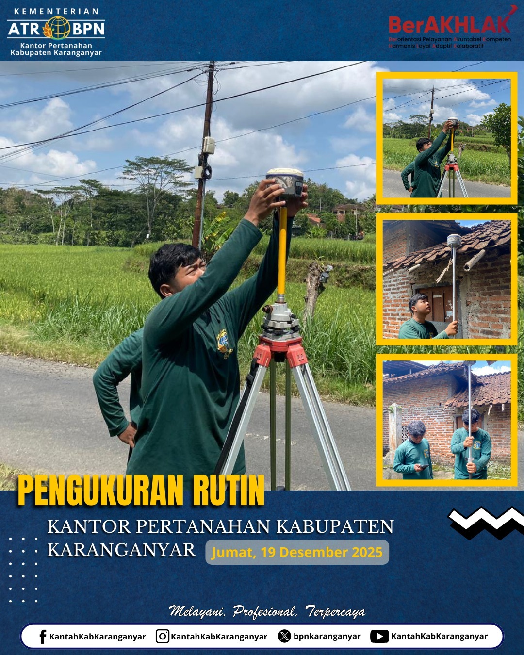 Jumat, 19 Desember 2025, Kantor Pertanahan Kabupaten Karanganyar menyelenggarakan kegiatan pengukuran tanah rutin di Desa Bangsri, Kecamatan Karangpandan, Kabupaten Karanganyar.