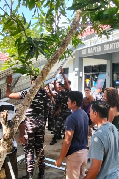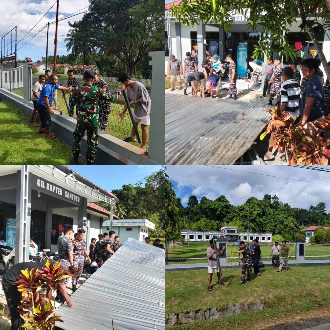 Manado 28 Januari 2026, Prajurit Pangkalan TNI AL (Lanal) Melonguane dibantu masyarakat Melonguane melaksanakan kegiatan pembersihan dan perbaikan sejumlah fasilitas Lanal pasca terjadinya aksi demonstrasi yang berlangsung beberapa waktu lalu bertempat di Lanal Melonguane. Rabu (28/1)