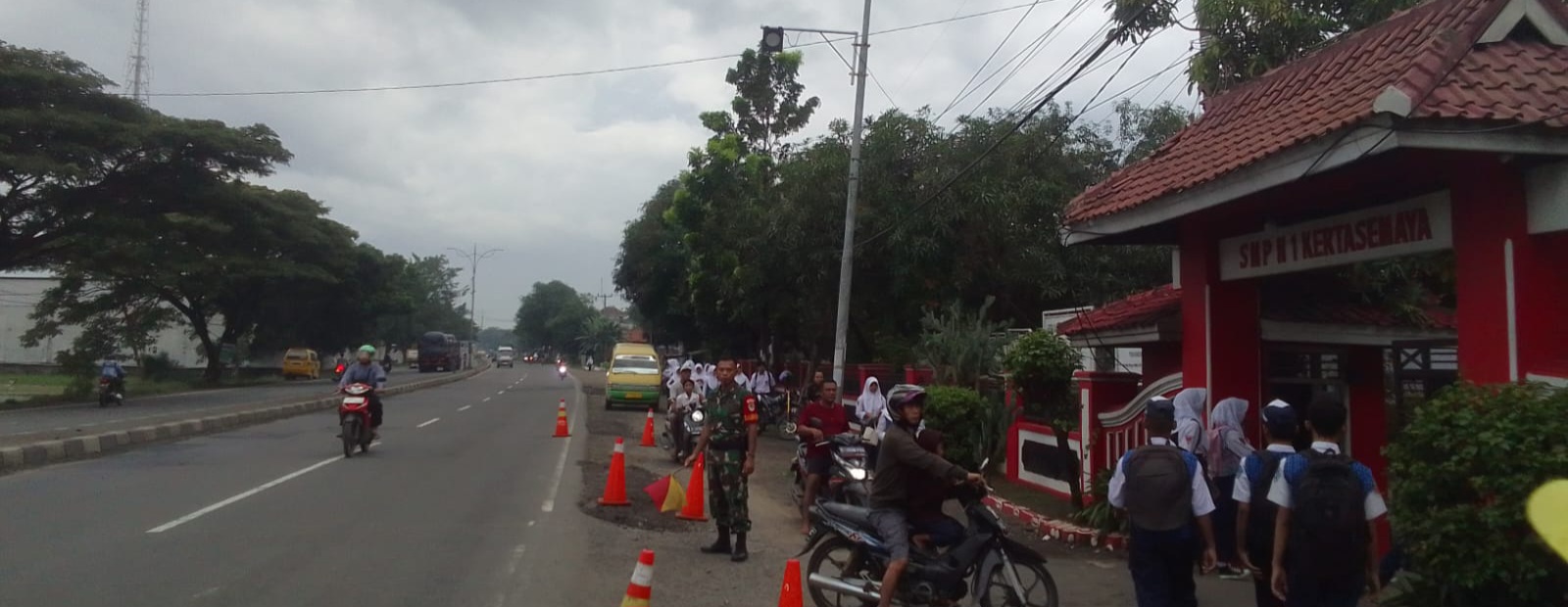 Kegiatan tersebut dilaksanakan oleh Sertu Duloh, anggota Koramil 1605/Sukagumiwang, sebagai bentuk kepedulian TNI terhadap keselamatan anak sekolah dan masyarakat pengguna jalan. Dalam pelaksanaannya, Sertu Duloh bersinergi bersama Tarsono, selaku petugas keamanan (security) sekolah.
