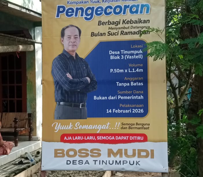 Indramayu,pikiranrakyatnusantara.com-Menyambut datangnya Bulan Suci Ramadan Tahun 2026, seorang pengusaha sukses yang akrab disapa Bos Mudi menunjukkan kepeduliannya kepada masyarakat dengan membangun jalan desa menggunakan dana pribadi. Kegiatan pengecoran jalan tersebut dilaksanakan pada Jumat, 14 Februari 2026, bertempat di Desa Tinumpuk Blok Vastell, Kecamatan Juntinyuat, Kabupaten Indramayu.