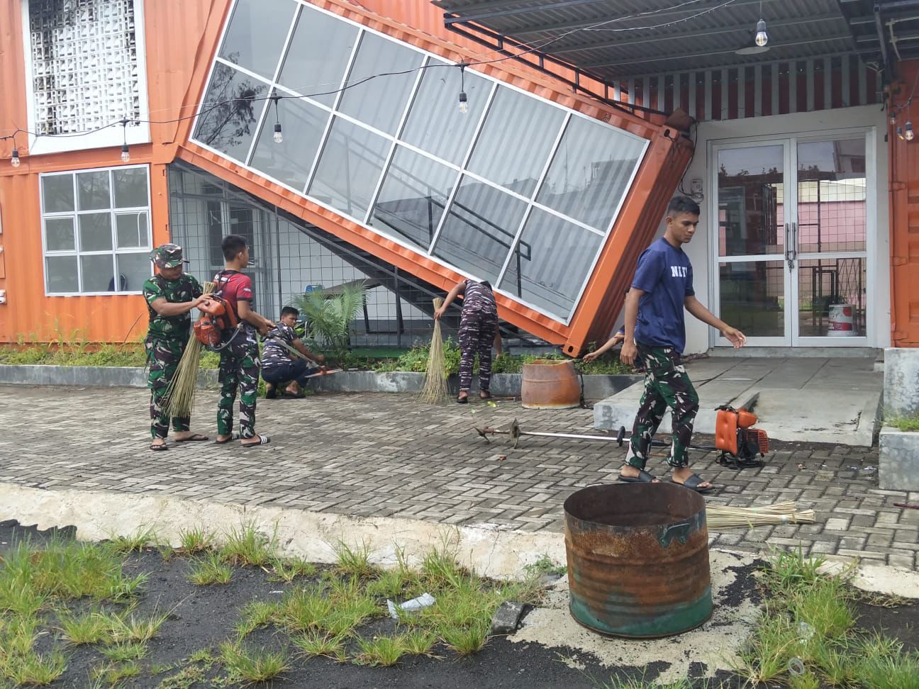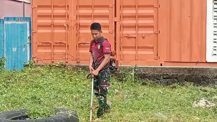 Bersama Koordinator Lapangan Bama, Serka Aryanto, Personel Satrol Kodaeral VIII melakukan pembersihan menyeluruh, mulai dari membersihkan halaman, merapikan area sekitar bangunan, hingga memangkas rumput agar area terlihat lebih tertata dan nyaman untuk digunakan.