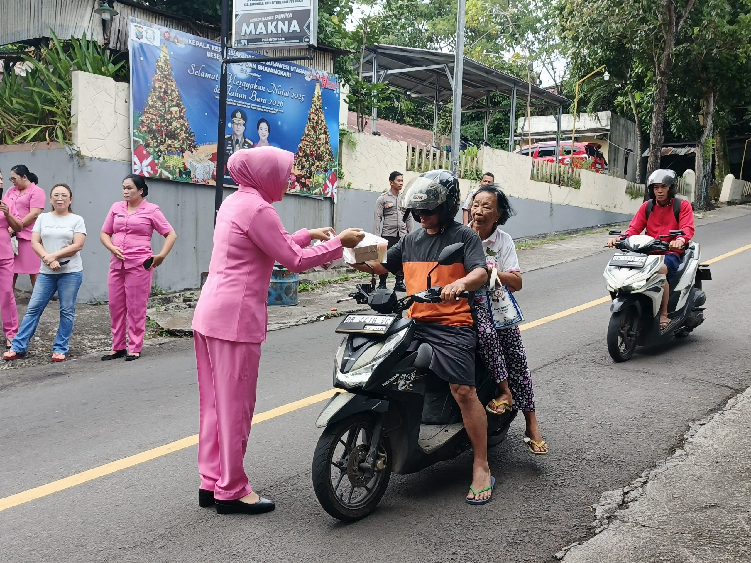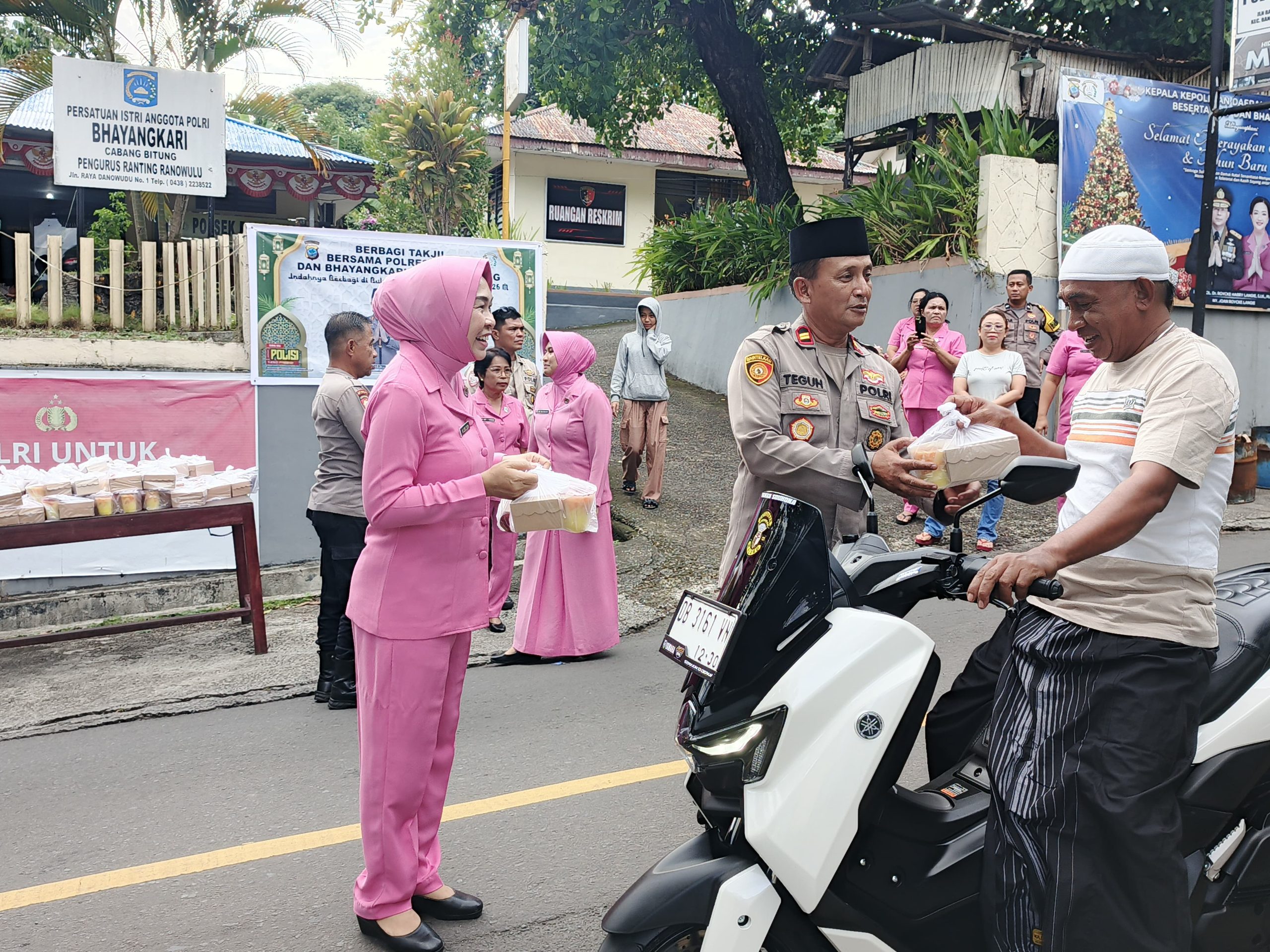 Suasana penuh kehangatan tampak saat personel Polsek bersama Bhayangkari dengan ramah menyapa dan menyerahkan takjil kepada masyarakat.