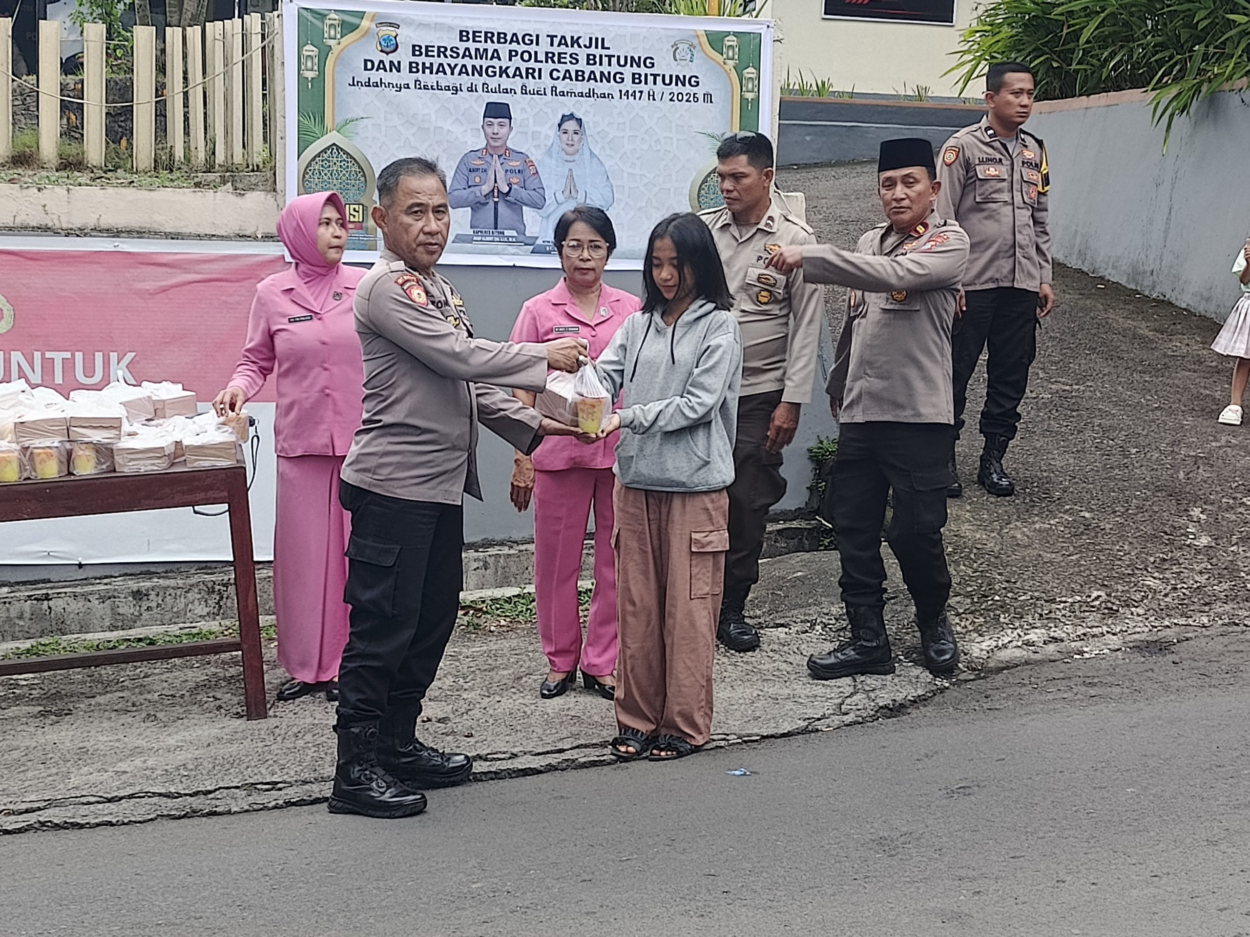 Bitung, 25 Februari 2026 – Dalam semangat kebersamaan dan kepedulian di Bulan Suci Ramadhan 1447 H/2026 M, Polres Bitung melalui Polsek Ranowulu bersama Bhayangkari Ranting Ranowulu menggelar kegiatan pembagian takjil kepada masyarakat, Rabu (25/02/2026) sore.