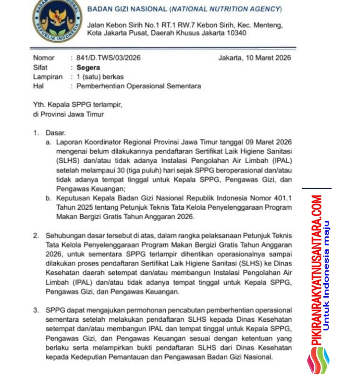 Keputusan tegas itu tertuang dalam surat Deputi Bidang Tata Kelola dan Pengawasan BGN Nomor 841/D.TWS/03/2026 tertanggal 10 Maret 2026, yang memerintahkan penghentian sementara operasional sejumlah dapur program MBG karena dinilai belum memenuhi standar operasional yang dipersyaratkan.