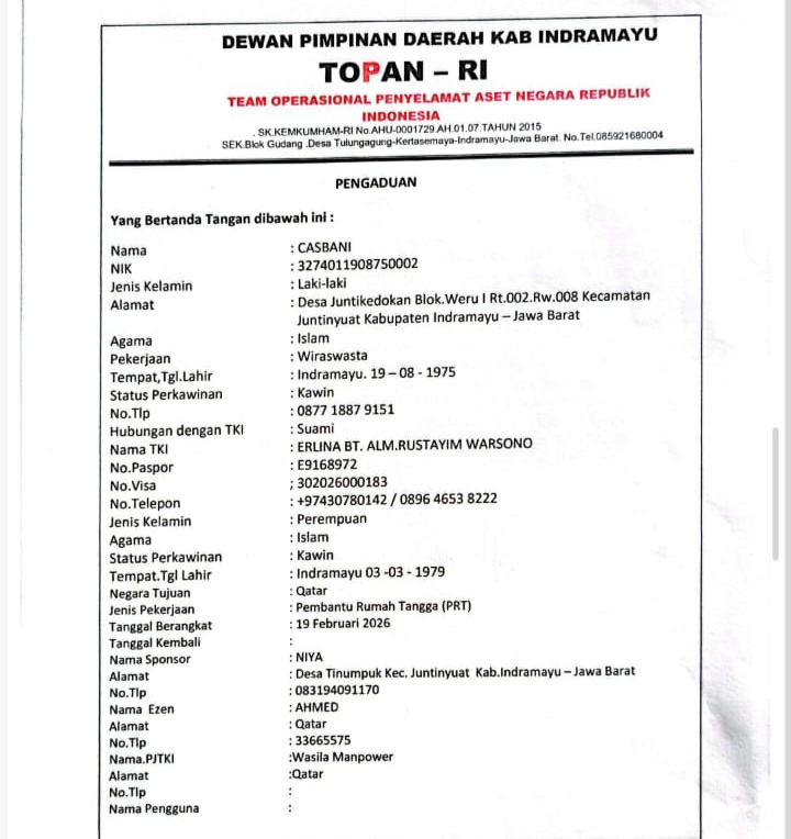 Suami Erlina, Casbani, mengadukan nasib istrinya ke DPD TOPAN RI Kabupaten Indramayu pada Senin (09/03/2026). Ia berharap istrinya dapat segera dipulangkan ke Indonesia untuk mendapatkan perawatan.