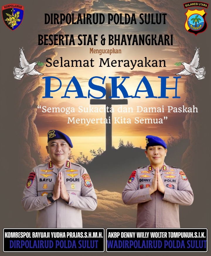 Bitung, 5 April 2026 — Direktorat Polisi Perairan dan Udara (Ditpolairud) Polda Sulawesi Utara menyampaikan ucapan Selamat memperingati Jumat Agung dan Hari Paskah kepada seluruh umat Kristiani, khususnya di Kota Bitung dan wilayah Sulawesi Utara.